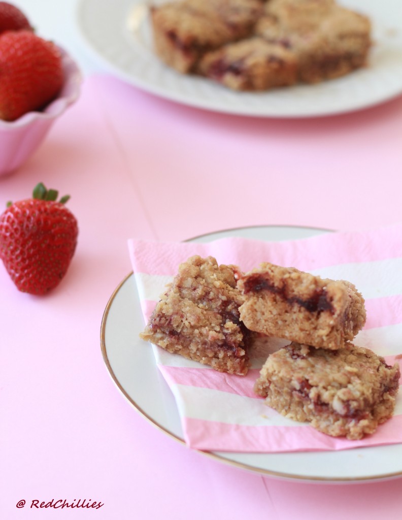 These bars are delicious, adaptable and very easy to make. You can substitute any preserves of your choice like raspberry, peach etc. I usually have strawberry preserves on hand and so I used it in this recipe.